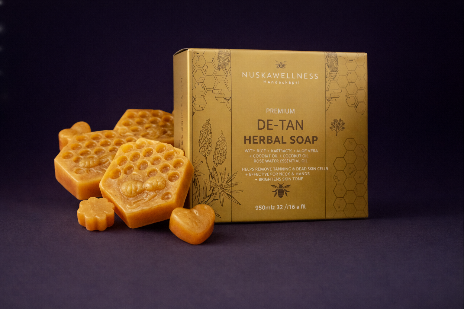 NuskaWellness De-Tan Herbal Soap helps reduce the appearance of tan and supports brighter-looking skin.